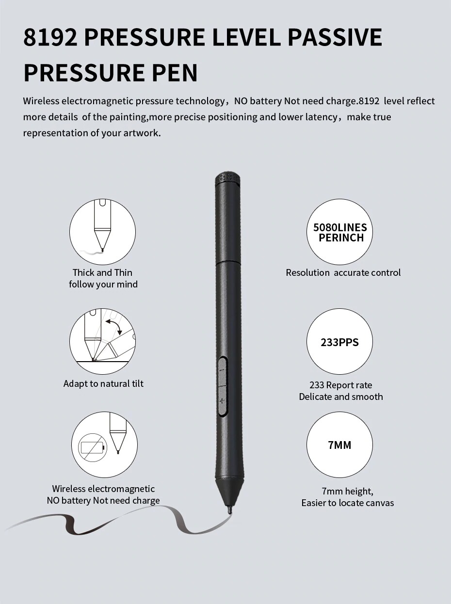 | 8192 Tekanan Sensitivitas Memiliki tingkat sensitivitas hingga 8192 tingkat tekanan. Hal itu membuat Anda dapat menggambar pada pen tablet ini dengan rasa yang sangat lembut. Saking lembutnya Anda akan merasa menggoreskan pensil di kertas fisik.