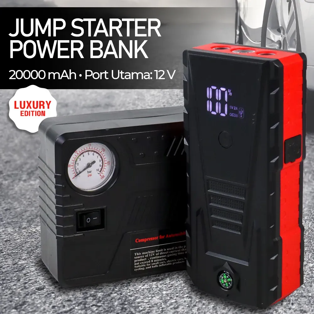 Jump starter ini tidak hanya berfungsi untuk mobil yang mogok, tetapi juga sebagai power bank dengan 4 slot USB dan 1 slot micro USB, serta senter LED untuk memenuhi kebutuhan perjalanan jauh maupun singkat.