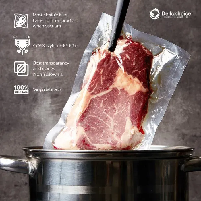 Delkochoice hadir dengan bahan Nylon LLPDE FOOD GRADE yang direkomendasikan untuk bahan makanan yang divakum seperti, kacang-kacangan, beras, atau makanan yang harus disimpan di suhu beku seperti daging, ikan, bakso, dll.