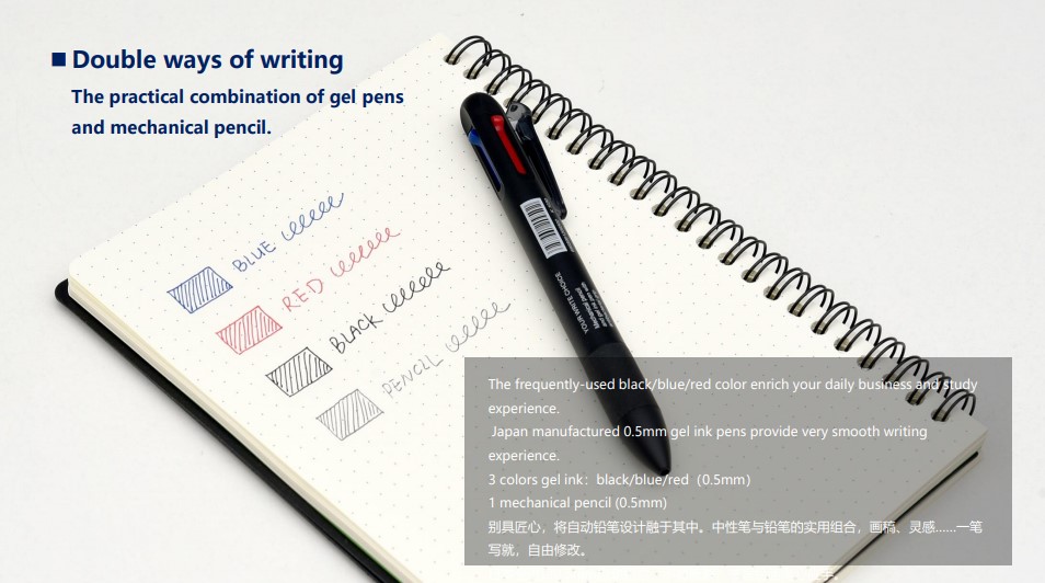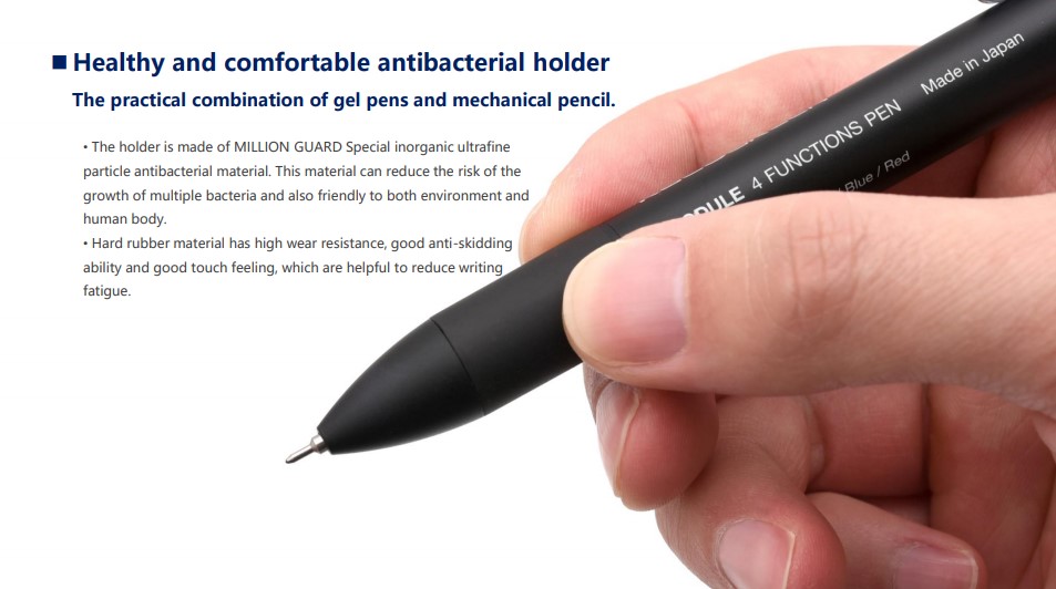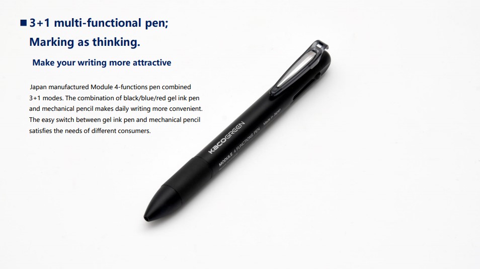 | 4 in 1 Pulpen ini didisain multifungsi yang mana terdapat 3 tinta pulpen dan 1 buah pensil mekanik. 3 tinta pulpen terdiri dari warna hitam, biru dan merah. Pensil mekanik dapat diisi ulang dengan menggunakan refill pensil. Terdapat juga penghapus pada bagian belakang pena.