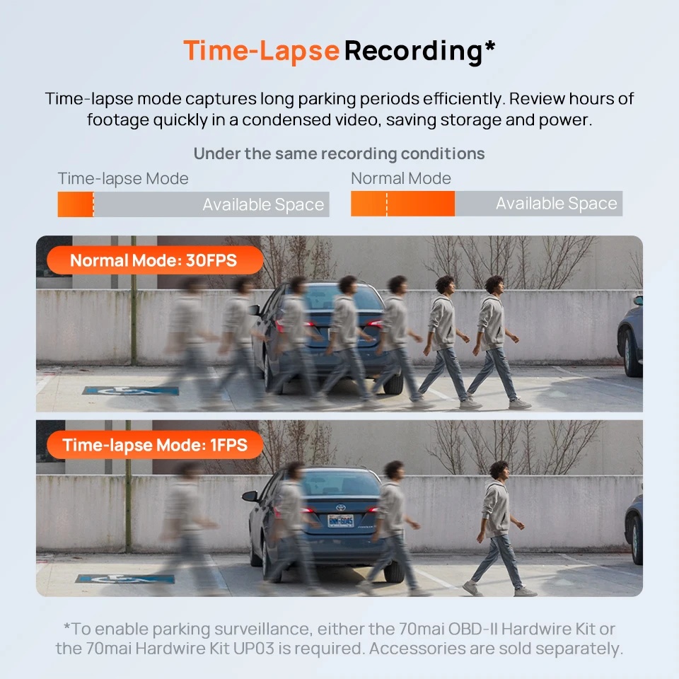 | Pantau Kendaraan 24 Jam Kamera mobil ini juga menawarkan mode parkir 24 jam, meski saat mesin dimatikan. Anda pun bisa memantaunya lewat aplikasi 70mai, sehingga menciptakan rasa tenang meski mobil sedang parkir. Aplikasinya juga memudahkan Anda untuk menyimpan gambar dan video. |