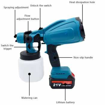 Pistol semprot cat dinding bertenaga tinggi dengan tekanan semprotan kuat yang mampu menyemprot cat berbasis air dan cat lateks secara merata. Dilengkapi 3 mode pola semprotan, sudut semprot adjustable hingga 45°, 90° dan 180° untuk hasil pengecatan lebih presisi. Cocok digunakan untuk dinding, furniture, kayu, besi, pagar, dan berbagai kebutuhan pengecatan rumah maupun DIY.