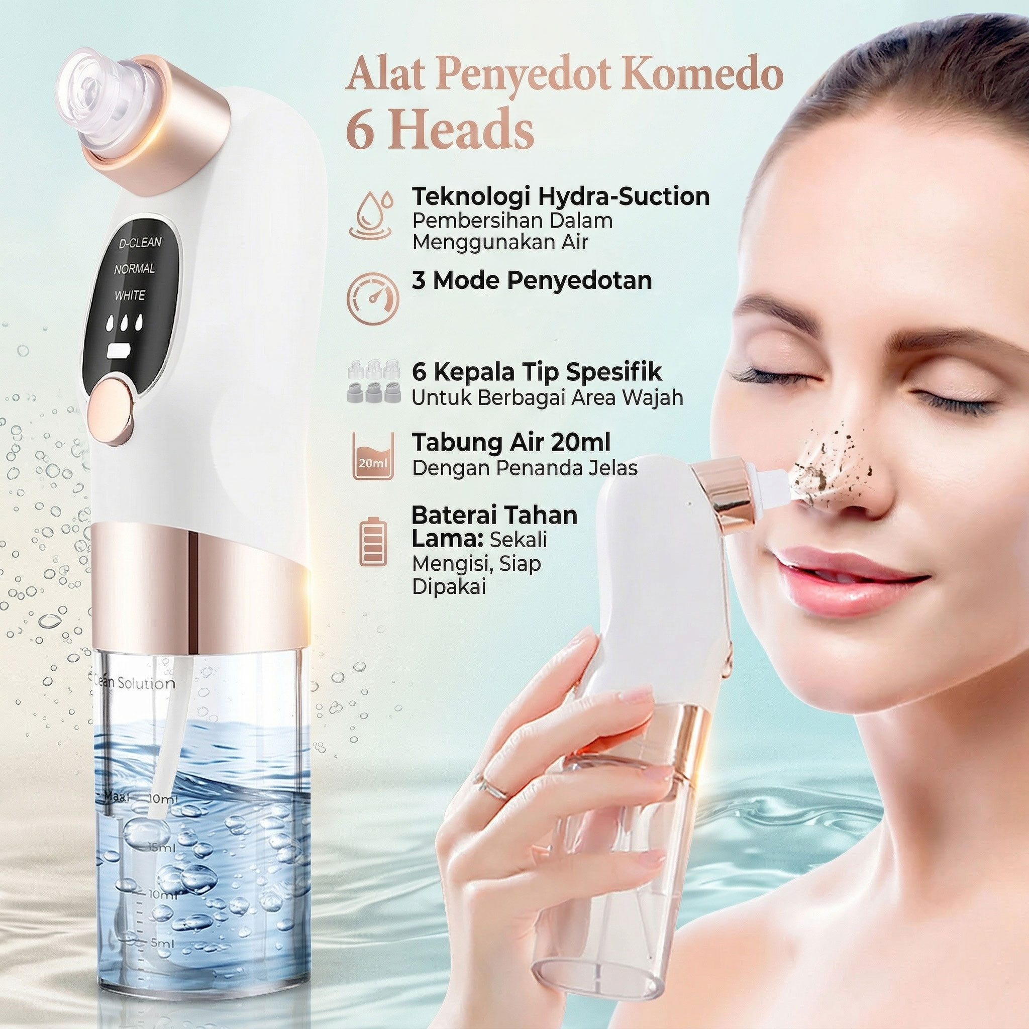 | Bersihkan Komedo Lebih Mendalam Mesin vakum yang dirancang khusus untuk menarik kotoran, minyak berlebih, dan komedo dari pori-pori kulit. Motor di dalamnya menciptakan tekanan negatif yang menghasilkan daya hisap menarik komedo putih, komedo hitam, serta kotoran lain yang menyumbat pori-pori. |