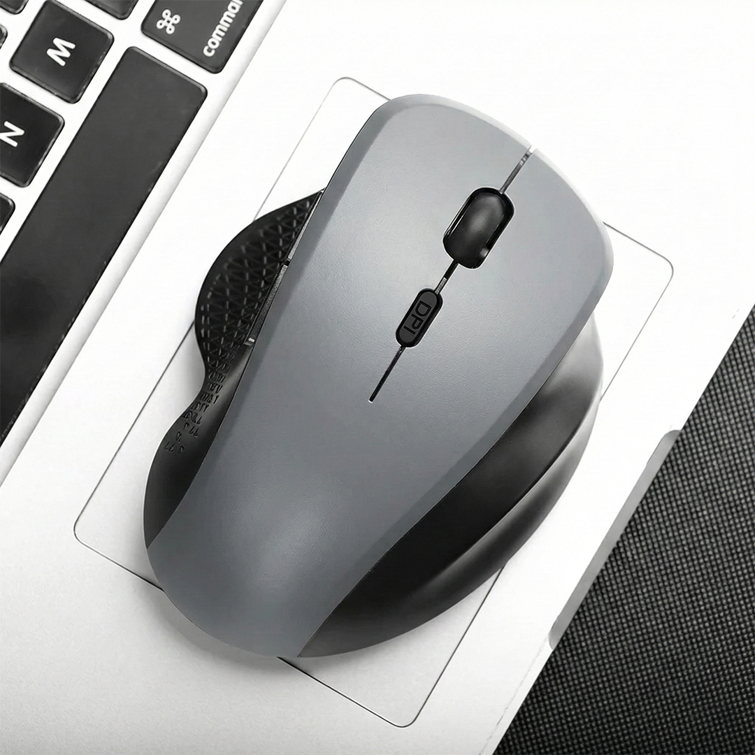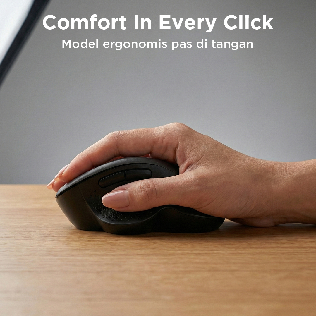 | Desain Ergonomis Nyaman Digunakan Mouse ini memiliki desain ergonomis yang mengikuti lekukan tangan sehingga nyaman digenggam dalam penggunaan jangka panjang. Terdapat sandaran jempol pada bagian samping yang membantu meningkatkan kenyamanan saat bekerja. Desain ini membantu mengurangi rasa lelah pada tangan. |