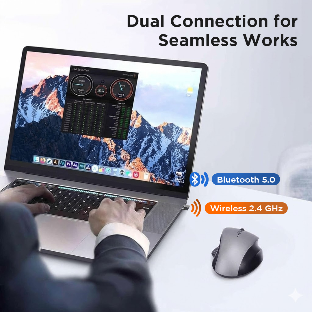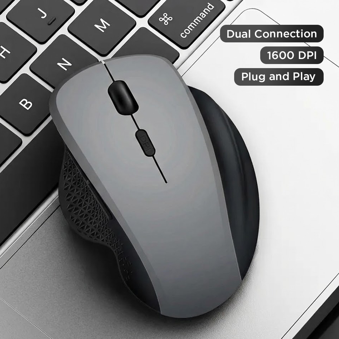 | Dual Connection Wireless Mouse mendukung dua jenis koneksi, yaitu Bluetooth 5.0 dan wireless 2.4 GHz melalui USB receiver. Teknologi ini memberikan fleksibilitas untuk menghubungkan mouse ke berbagai perangkat. Koneksi stabil dengan jangkauan hingga sekitar 10 M memastikan penggunaan tetap lancar. |
