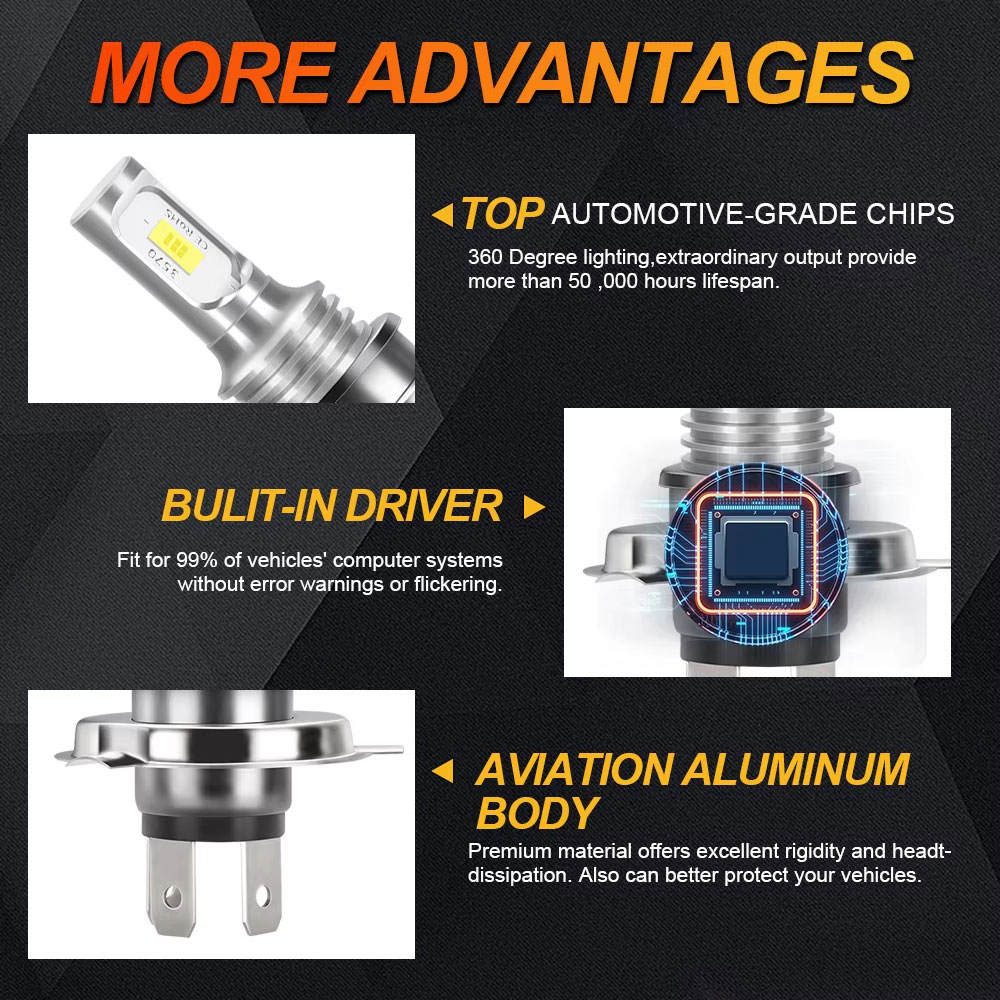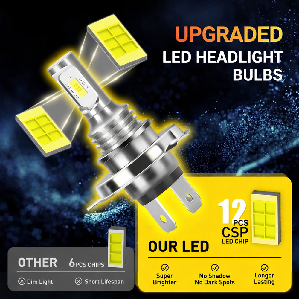 | Chip CSP LED 3670 Lampu depan mobil LED H4 CSP menggunakan teknologi CSP Chips generasi terbaru yang menghasilkan cahaya lebih terang dan merata dibanding lampu halogen biasa. Distribusi cahaya 360 derajat membantu penerangan jalan lebih luas tanpa titik gelap. Selain itu, cahaya tetap fokus sehingga tidak menyilaukan pengendara lain. Cocok untuk penggunaan harian maupun perjalanan jauh malam hari. |