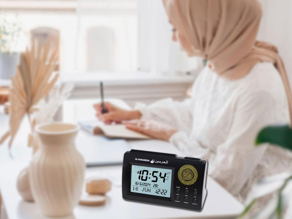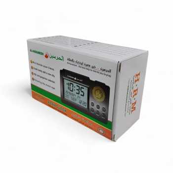 Jam meja AL‑HARAMEEN: penunjuk waktu digital dengan alarm azan 5 waktu, kalender Hijriah dan Masehi, tampilan LED informatif, serta dua mode daya. Praktis, religius, dan modern dalam satu perangkat.