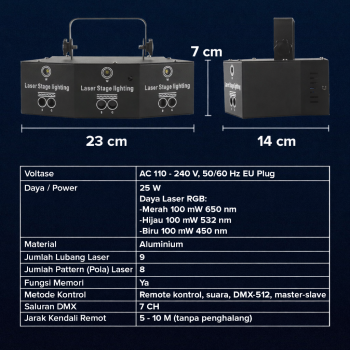Buat suasana pesta semakin gemerlap menggunakan proyektor laser dari ALiEN ini. Lubang-lubang lasernya akan menghasilkan beragam warna laser hingga 8 pattern. Menggunakan remot kontrol, berbagai sistem pengendalian pun telah didukung mulai dari suara, DMX-512, otomatis, hingga kontrol master slave. Segera ciptakan suasana yang menyenangkan di tiap acara Anda dengan lampu disko yang satu ini.