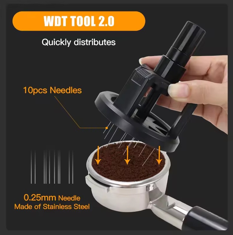 | Distribusi Bubuk yang Tepat Sasaran Alat ini dilengkapi dengan 10 jarum yang masing-masing memiliki diameter sekitar 0.25 mm. Fungsi dari jarum-jarum halus ini adalah untuk mengurai dan mendistribusikan bubuk kopi secara merata dalam portafilter sebelum proses tamping. Dengan jarum kecil dan banyak, Anda dapat memastikan bahwa bubuk kopi tidak menggumpal, tidak ada rongga udara besar, dan permukaannya lebih homogen. |