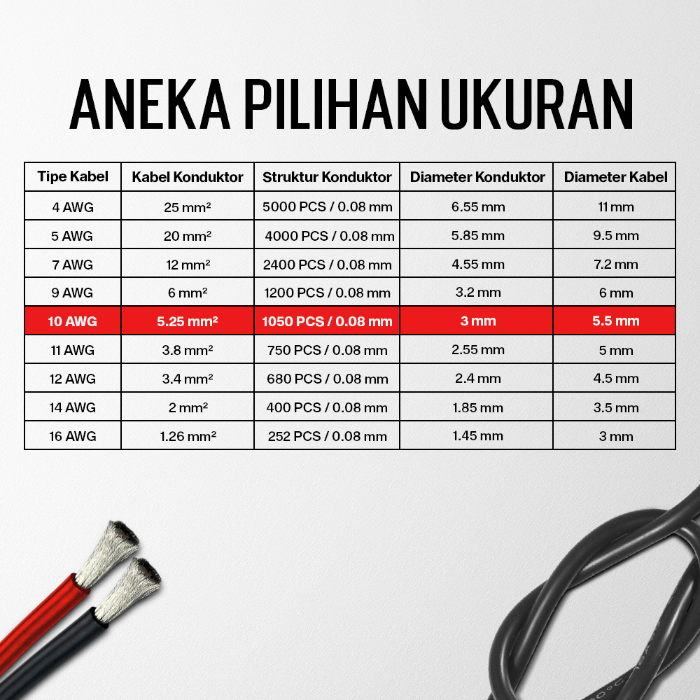 | Aneka Pilihan Ukuran Tersedia dalam banyak varian ukuran, mulai dari 4 AWG hingga 16 AWG, gunakan kabel untuk emnyuplai listrik ke berbagai kebutuhan. |