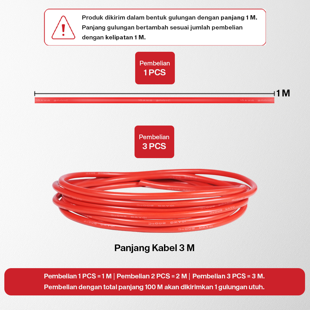 Panjang kabel yang dikirim akan bertambah sesuai jumlah pembelian (kelipatan 1 M). Jika membeli 6 PCS, maka panjang kabel menjadi 6 M. Untuk pembelian sepanjang 100 M akan dikirimkan 1 gulungan kabel utuh.