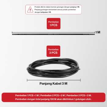 Panjang kabel yang dikirim akan bertambah sesuai jumlah pembelian (kelipatan 1 M). Jika membeli 6 PCS, maka panjang kabel menjadi 6 M. Untuk pembelian sepanjang 100 M akan dikirimkan 1 gulungan kabel utuh.