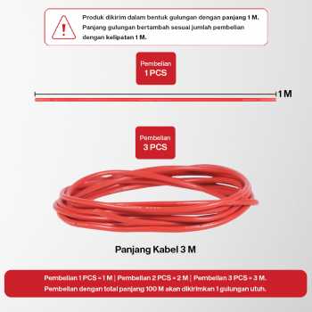 Panjang kabel yang dikirim akan bertambah sesuai jumlah pembelian (kelipatan 1 M). Jika membeli 6 PCS, maka panjang kabel menjadi 6 M. Untuk pembelian sepanjang 100 M akan dikirimkan 1 gulungan kabel utuh.