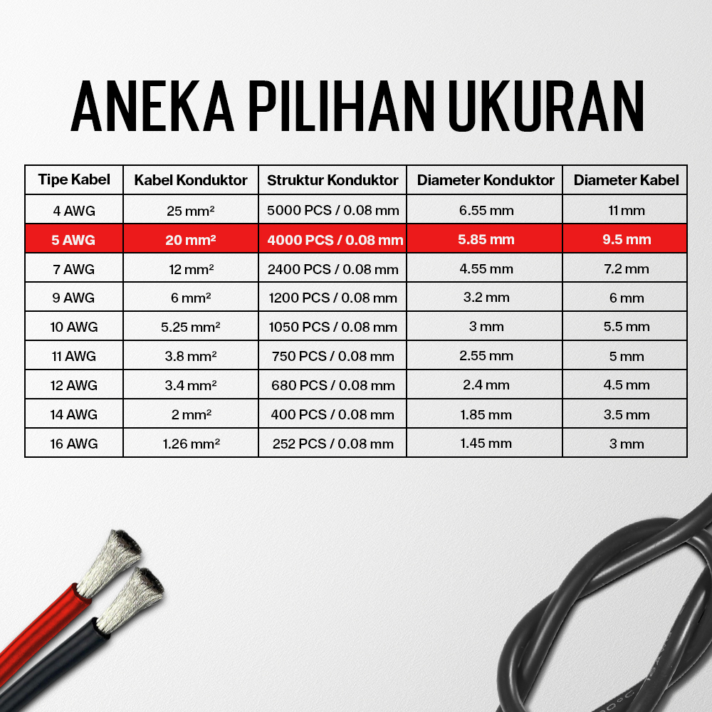 | Aneka Pilihan Ukuran Tersedia dalam banyak varian ukuran, mulai dari 4 AWG hingga 16 AWG, gunakan kabel untuk emnyuplai listrik ke berbagai kebutuhan. |