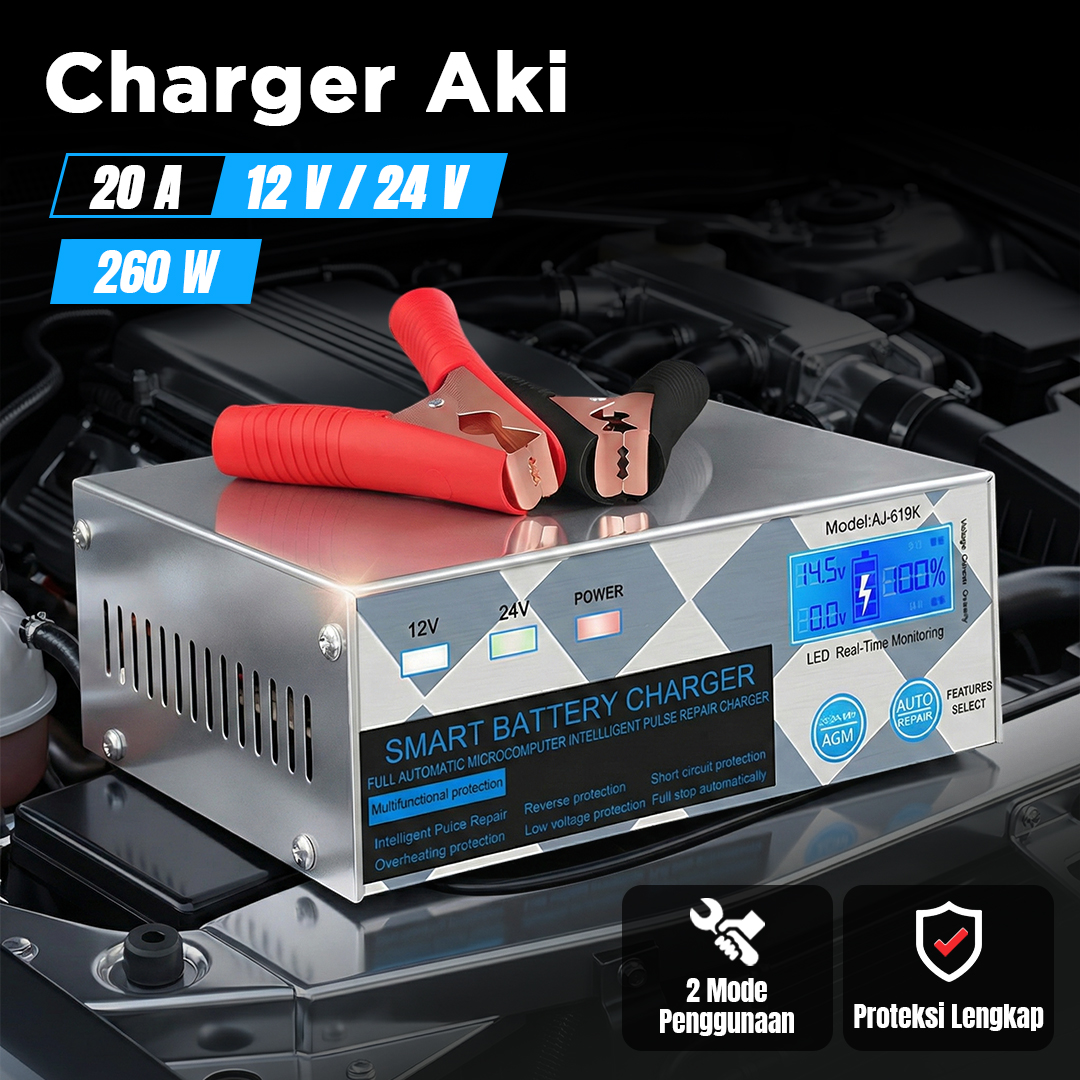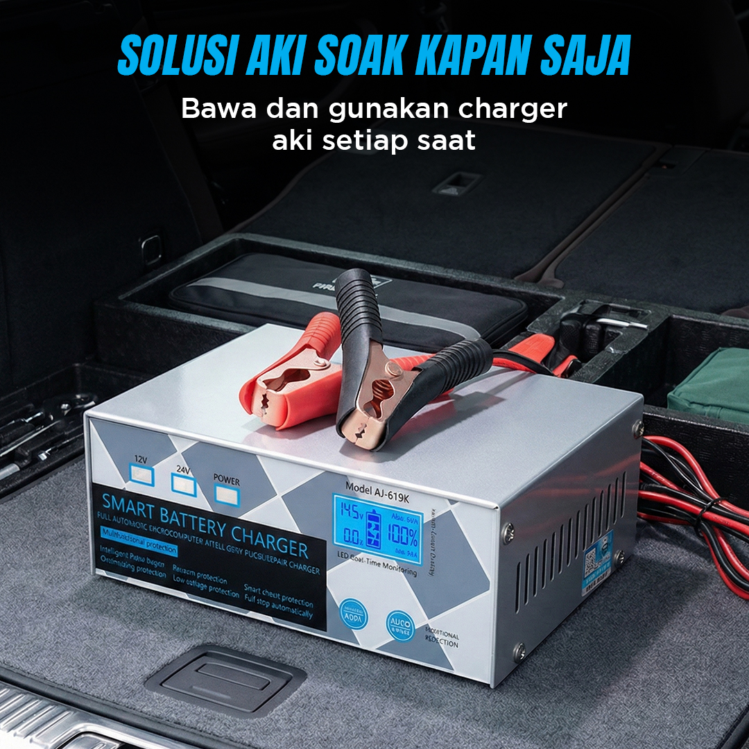 Bermasalah dengan aki yang sering drop? Kini Anda dapat mengisi daya aki kendaraan di rumah menggunakan charger aki ANJING. Dibuat untuk aneka jenis kendaraan, charger aki ini cocok untuk kendaraan dengan sistem kelistrikan 12 V dan 24 V. Model portable memudahkan Anda membawa charger aki. Lengkap dengan mode repair dan proteksi lengkap untuk memastikan tetap aman digunakan.