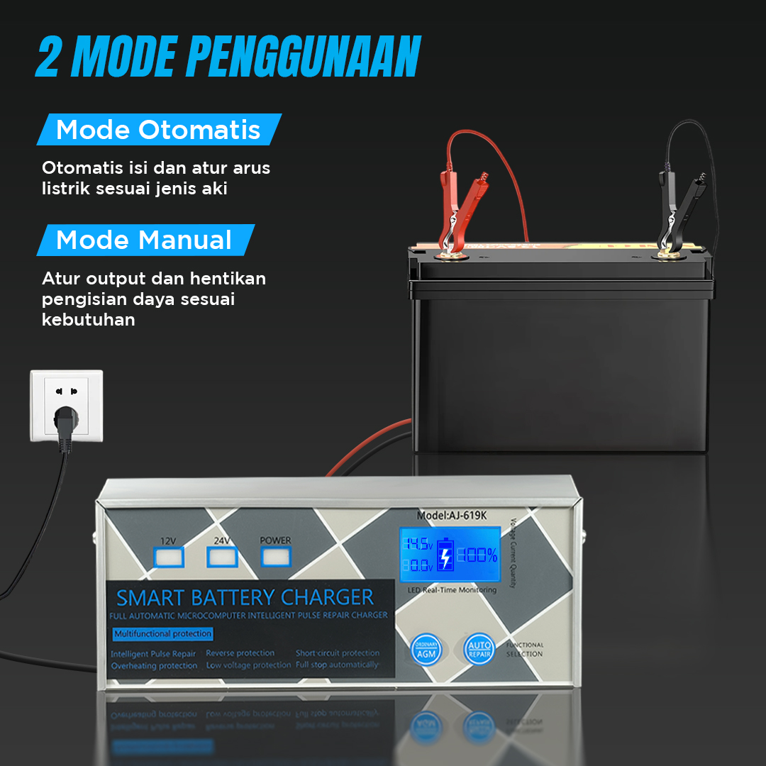 | 2 Mode Penggunaan Menawarkan 2 mode penggunaan, gunakan charger aki untuk mengisi ulang aki mobil dan motor. Mode otomatis cocok untuk mengisi daya aki tanpa repot mengatur tegangan. Mode cocok Anda yang ingin mengisi daya aki sesuai kebutuhan. |
