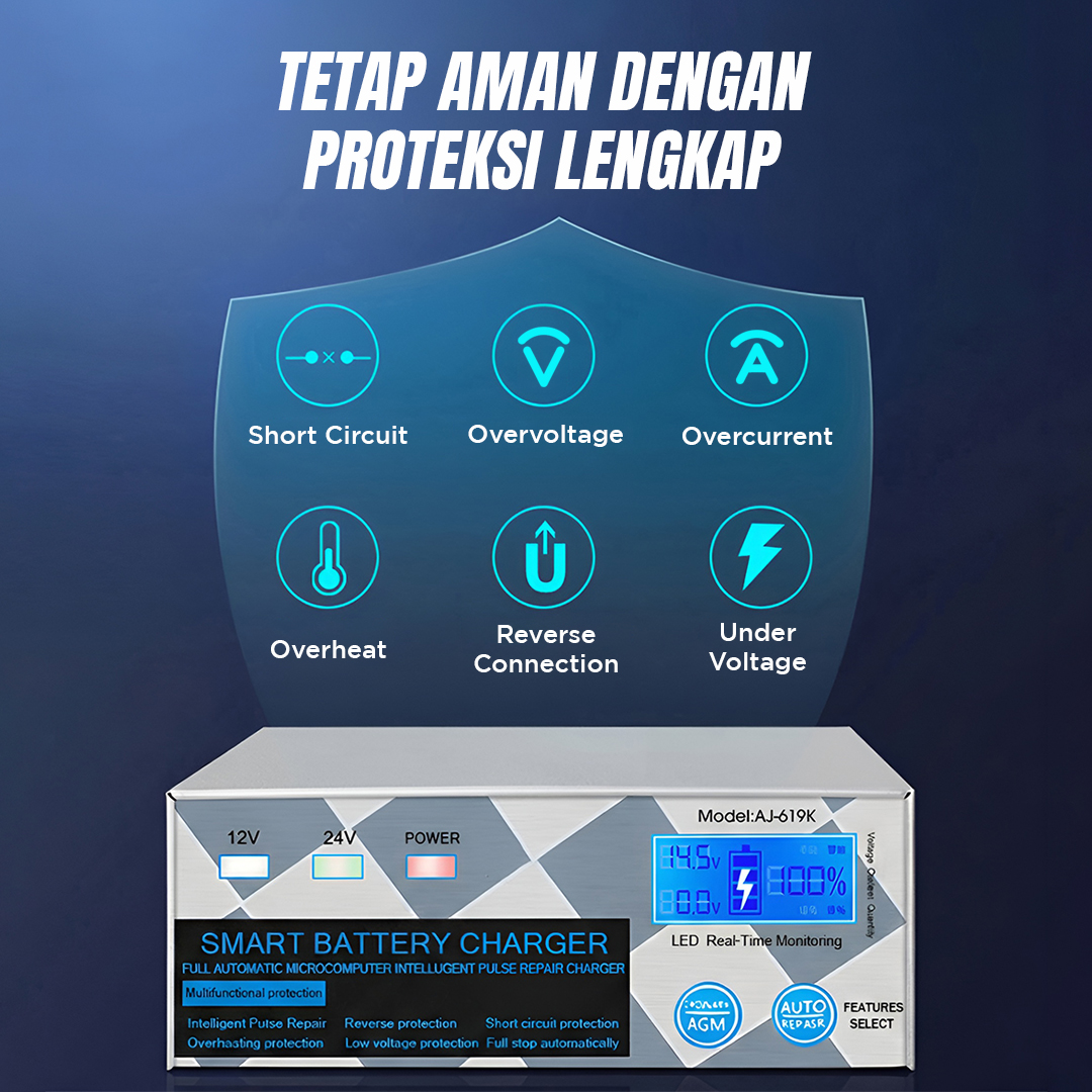 | Fitur Anti Overcharge untuk Mencegah Kerusakan Baterai Fitur intelligent charger juga membuat charger aki ini dilengkapi proteksi lengkap. Mulai dari proteksi arus pendek hingga pengisian daya berlebih, kini Anda dapat mengisi daya aki kendaraan dengan aman. |