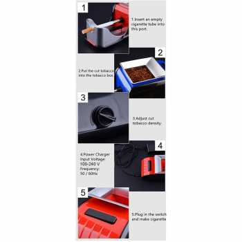 | Cara Penggunaan Cara penggunaan alat ini cukup mudah. Pertama, tuang tembakau pada wadah yang terletak di bagian atas, kemudian siapkan kertas rokok dan masukkan ke dalam lubang. Setelah itu tekan tombol dan alat akan bekerja untuk menggulung rokok secara sempurna. Lebih lengkapnya Anda dapat mengecek panduan penggunaan yang terdapat di dalam kotak. |