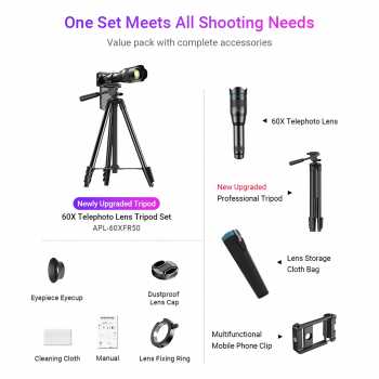 Produk dari APEXEL ini merupakan aksesori sempurna untuk keperluan fotografi smartphone. Terdapat telephoto dengan pembesaran 60x untuk menunjang kebutuhan fotografi. Dengan desain klip dan tripod, lensa kamera tambahan ini bisa digunakan di banyak tipe smartphone Android maupun iPhone.
