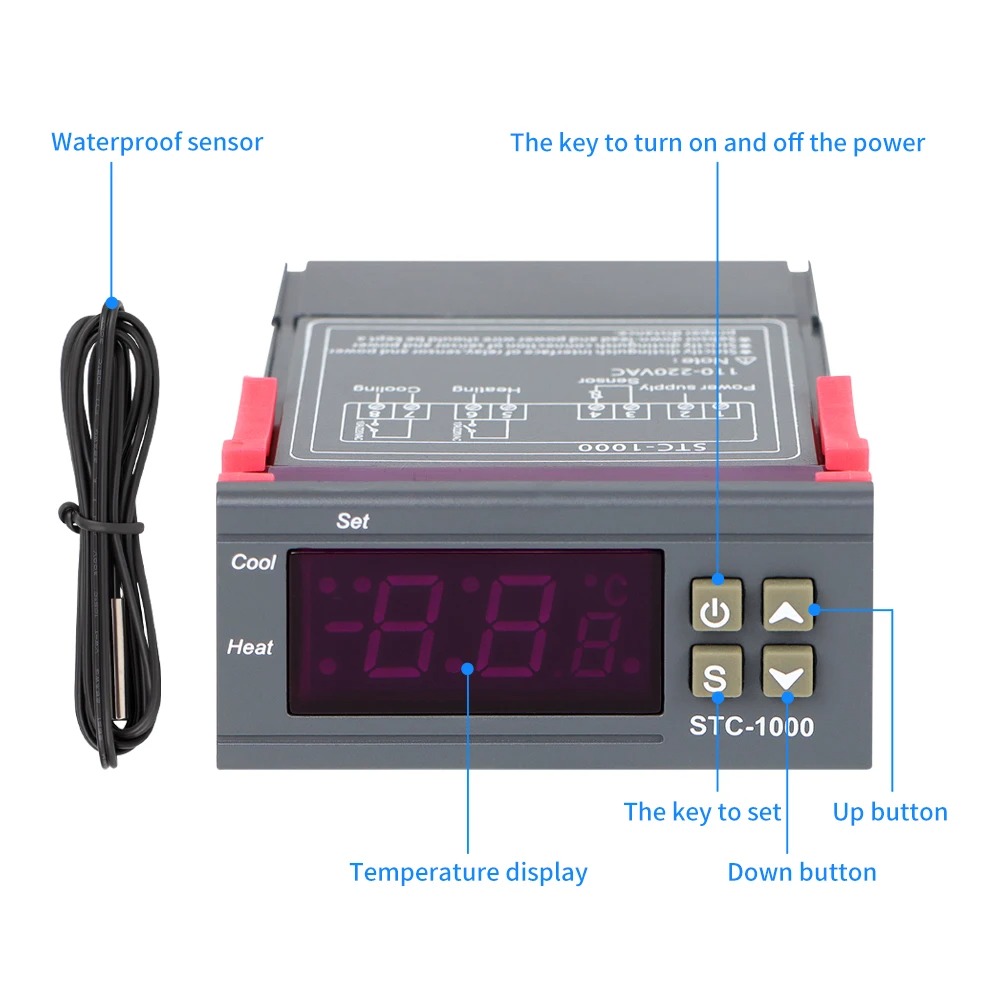 Kontroler untuk menjaga suhu air ini dilengkapi dengan sensor untuk mengetahui suhu air di dalam akuarium. Anda juga dapat mengombinasikan kontroler temperatur ini dengan pemanas air sehingga pemanas dapat beroperasi secara otomatis mengikuti pengaturan kontroler temperatur.