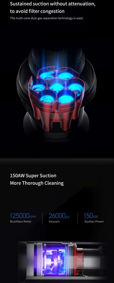 | Strong Power Design Vacuum cleaner ini menggunakan independent motor drive yang membuat penyedot debu ini mampu menyedot debut dengan sangat baik. Kecepatan dari motornya sendiri bisa hingga 125000rpm dan memiliki fitur anti winding comb teeth yang membuat rambut-rambut tidak akan kusut di dalam.