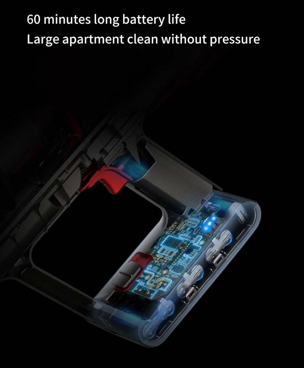 | Smart Battery Management Di bagian baterai, vacuum cleaner ini menggunakan manajemen smart battery yang akan memonitor status dari baterai kamu sehingga pemakaian baterai bisa lebih lama. Dalam kondisi baterai full, penyedot debu ini bisa menyedot hingga 60 menit.