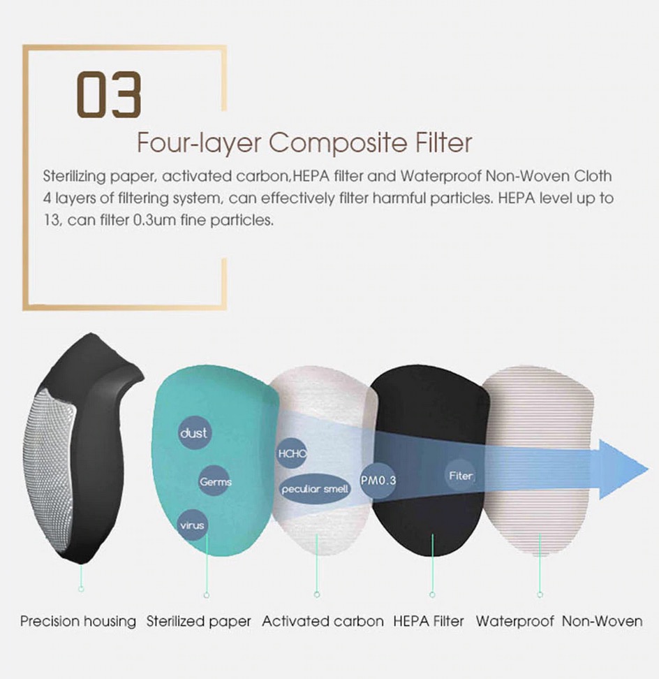 | Filter Komposit Empat Lapisan Masker ini menggunakan 4 lapis filter termasuk HEPA filter di dalamnya yang secara efektif dapat menyaring partikel micron seperti kuman, virus, debu, asap dan partikel kecil lainnya sehingga Anda terhindar dari bahaya virus yang dapat mengancam jiwa.