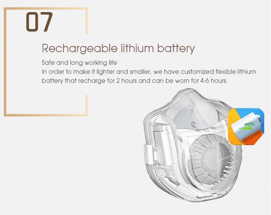 | Baterai Lithium Isi Ulang Kipas yang ada di dalam masker ini menggunakan baterai yang tahan lama dan dapat diisi ulang setelah baterainya habis. Baterainya mampu bertahan selama 4 hingga 6 jam dengan waktu pengisian daya baterai selama 2 jam.