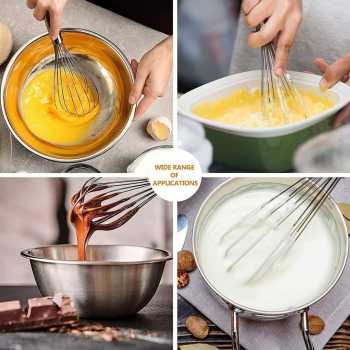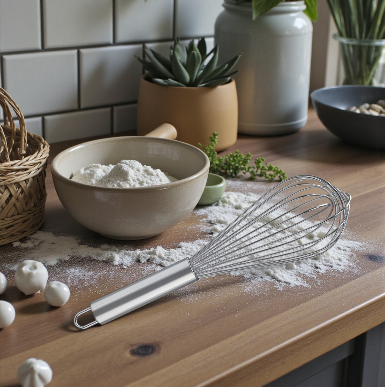 | Stainless Steel Tahan Karat Terbuat dari stainless steel 430 di bagian kepala dan atainless steel 410 di bagian pegangan yang kokoh dan anti karat, whisk ini jauh lebih awet dibandingkan whisk plastik atau besi biasa. Bahan ini tidak menyerap bau, tidak bereaksi dengan makanan, dan aman digunakan untuk persiapan berbagai hidangan. Cocok untuk pemakaian harian di rumah maupun dapur profesional. |