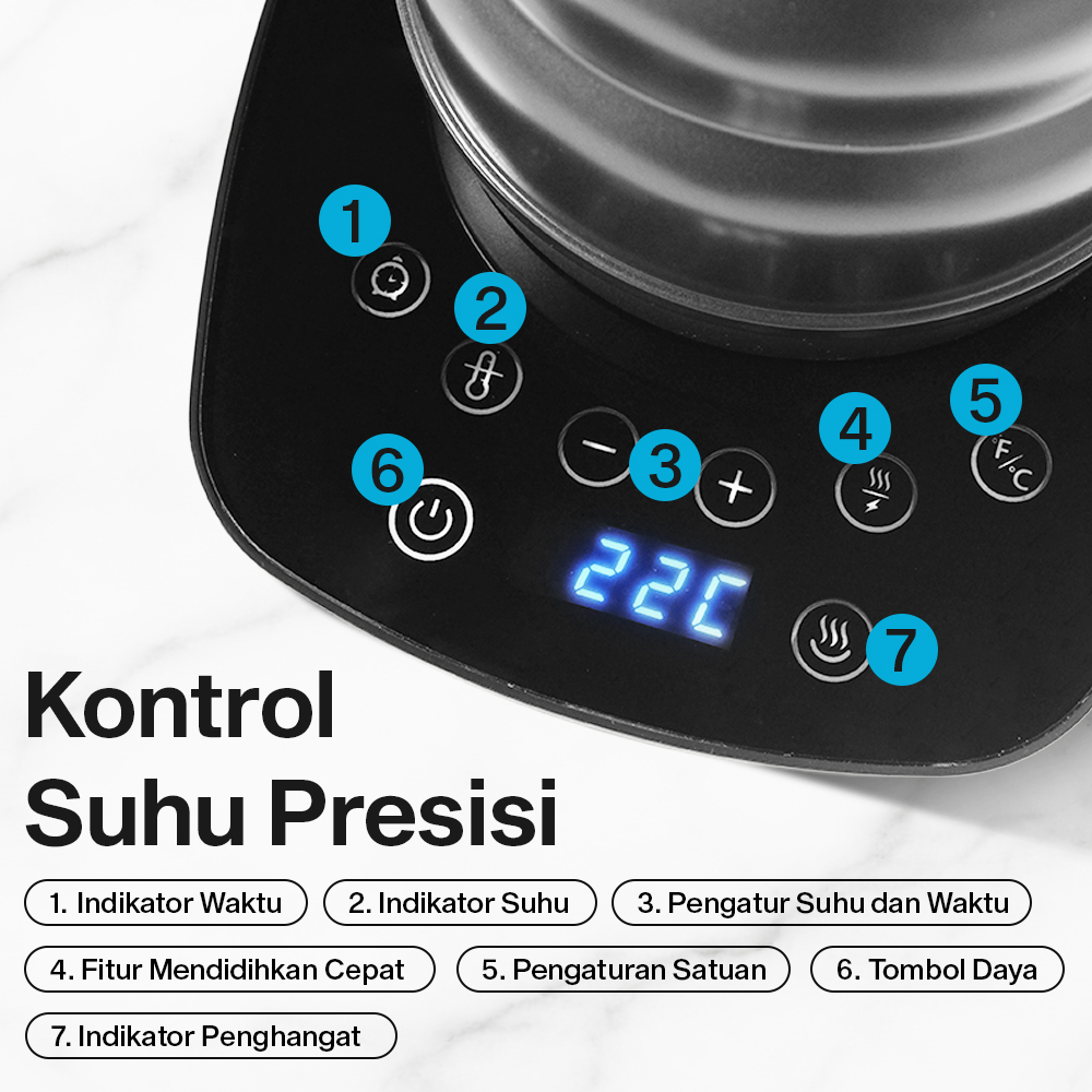 | Kontrol Suhu Presisi Atur suhu teko listrik sesuai kebutuhan untuk merebus dan menghangatkan air. Pilih suhu air lewat panel kontrol presisi yang lengkap dengan display LED untuk memantau proses merebus air. |
