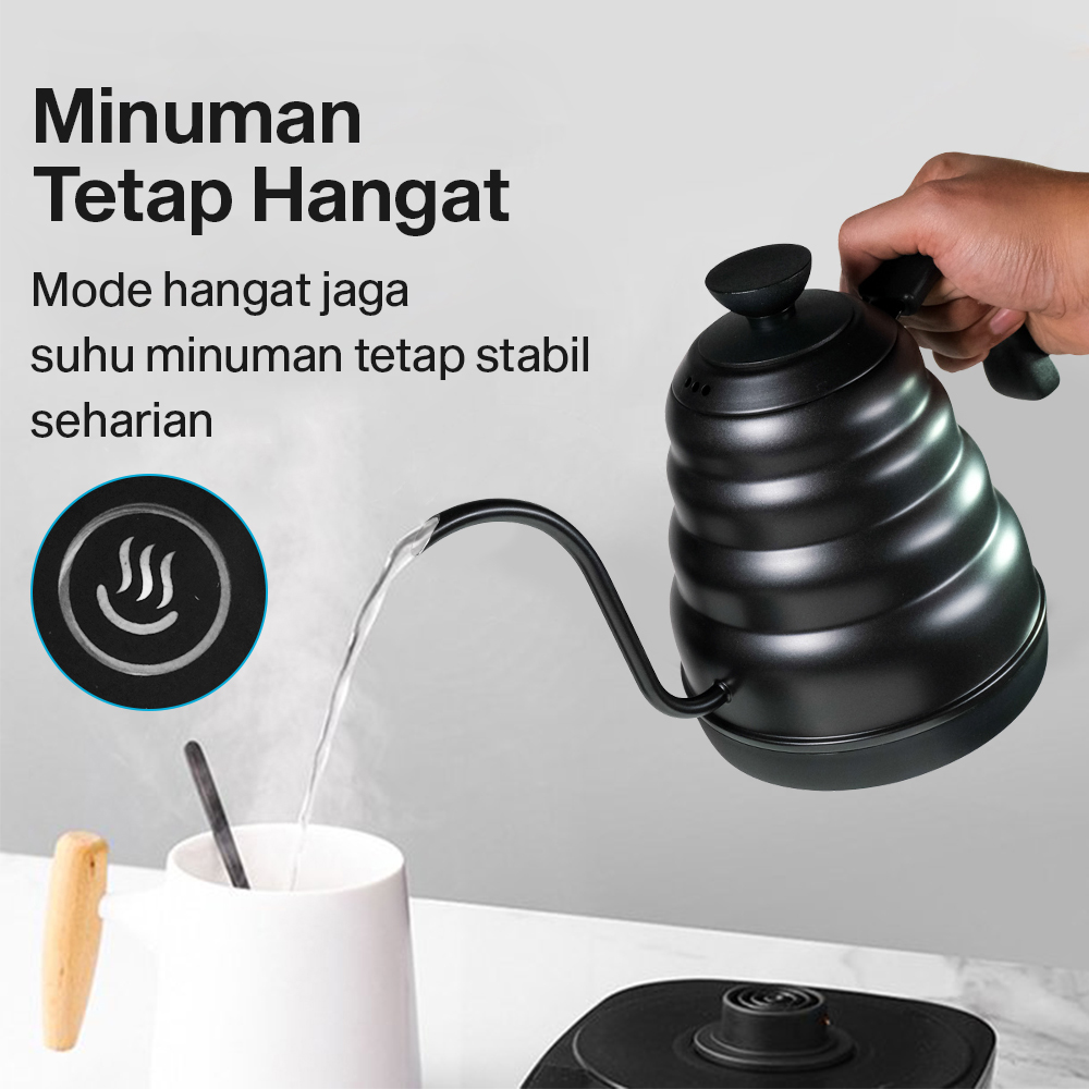 | Minuman Tetap Hangat Mode hangat jaga minuman agar tetap hangat. Teko listrik dilengkapi timer dengan durasi 24 jam untuk memastikan suhu minuman tetap stabil sepanjang hari. |