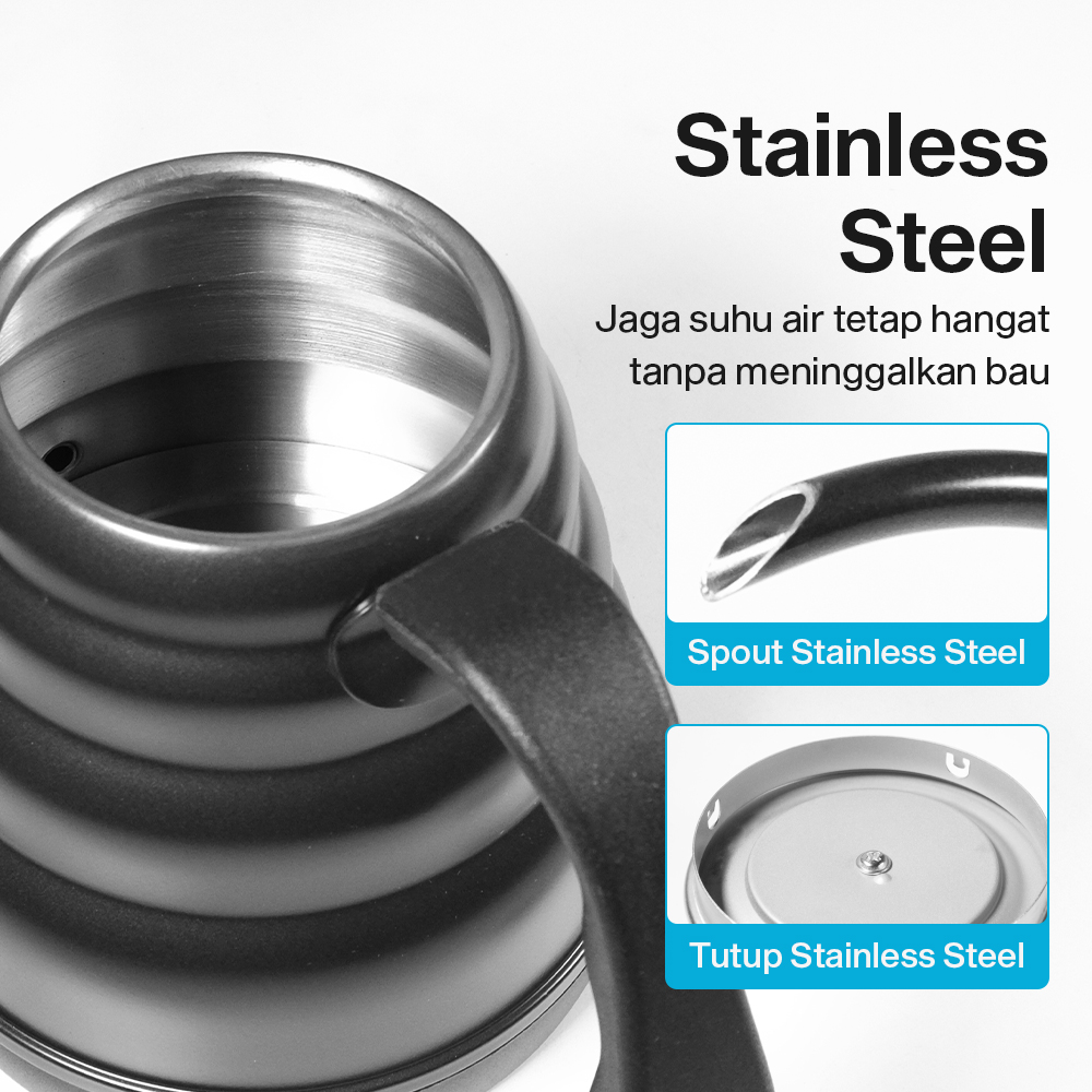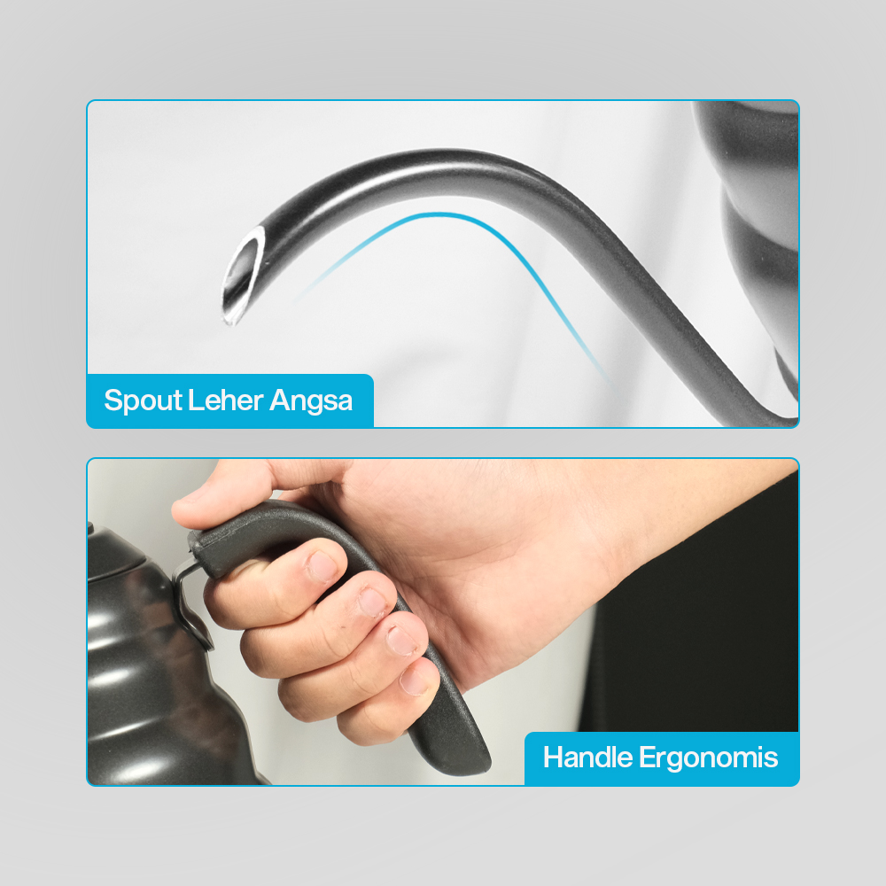 | Aliran Kopi Stabil Anti Tumpah Spout leher angsa menghasilkan aliran air yang tipis dan terarah untuk proses pouring yang lebih akurat. Kombinasi dengan gagang ergonomis membantu menjaga keseimbangan saat menuang sehingga meminimalkan risiko tumpah. Fitur ini penting untuk teknik pour over yang membutuhkan kontrol aliran air yang baik. |