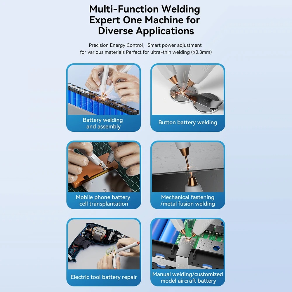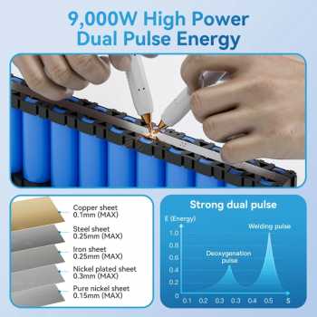 | Mendukung Pengelasan Berbagai Material Mesin ini mampu mengelas berbagai jenis material dengan variasi ketebalan seperti tembaga 0.1 mm, nikel murni 0.15 mm, pelapisan nikel 0.3 mm, lembaran baja 0.25 mm, dan lembaran besi 0.25 mm. Ideal untuk perakitan pack baterai 18650, 21700, 32650, serta kebutuhan elektronik presisi lainnya. |