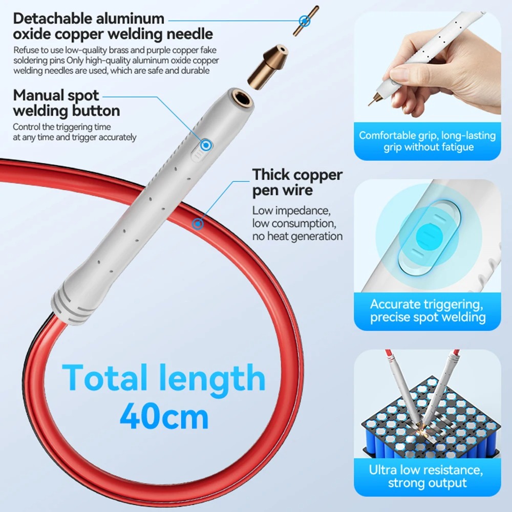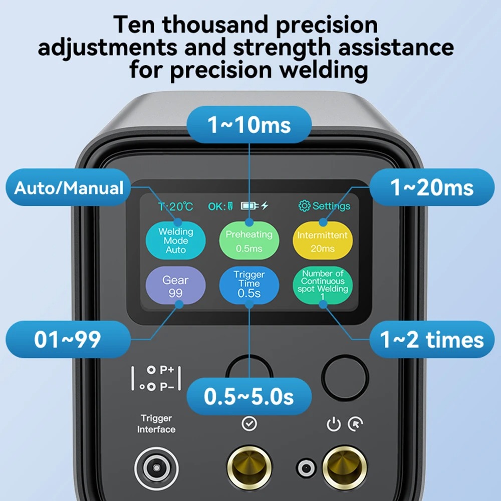 | Beragam Mode Tersedia Mendukung mode manual dan mode otomatis, sehingga Anda dapat memilih kontrol penuh melalui tombol pada pena las. Durasi pengelasan juga bisa diatur dengan presisi tinggi dalam rentang milidetik. |