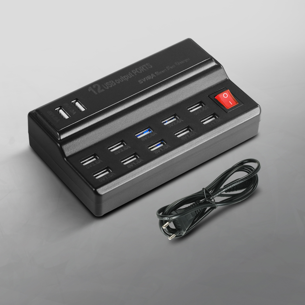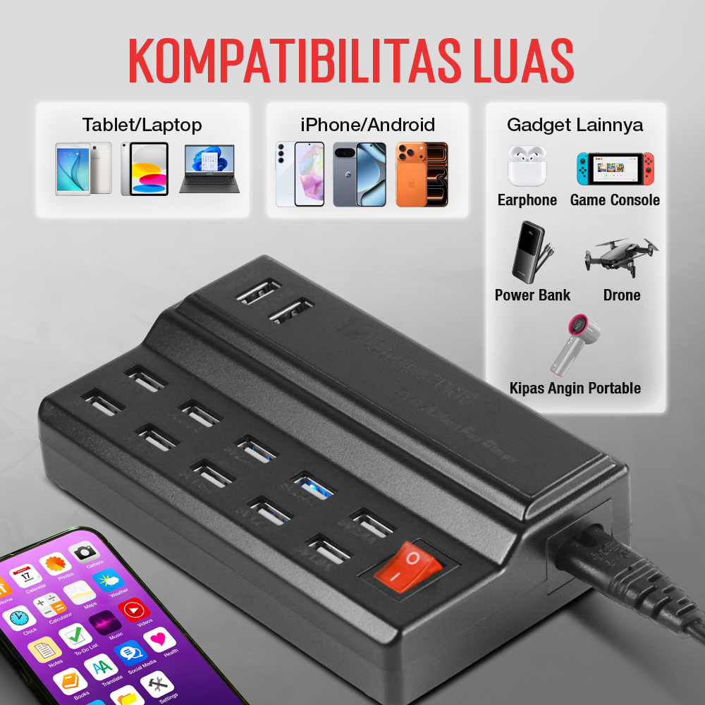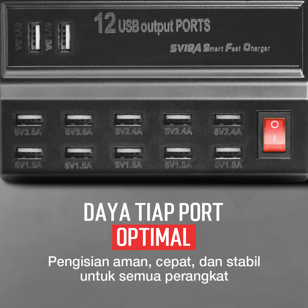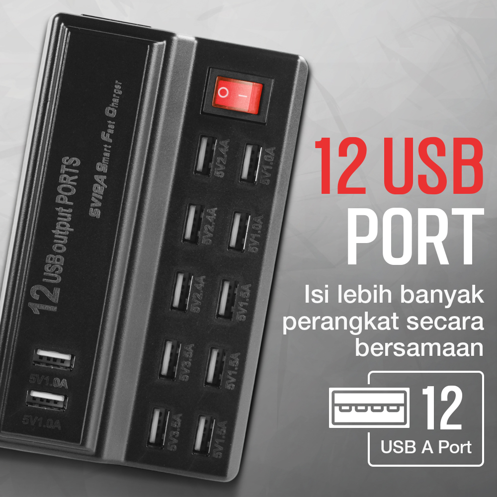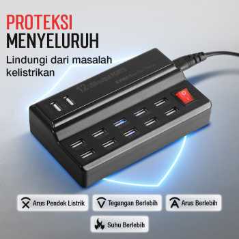 | Lebih Banyak, Lebih Cepat Dengan hadirnya 12 buah port USB, Anda bisa mengisi ulang daya smartphone tanpa perlu adaptor atau konverter tambahan. |