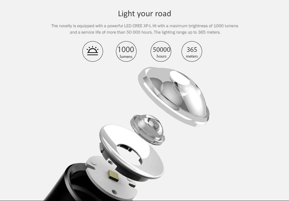 | XP-L HI Senter LED ini dilengkapi dengan sebuah XP-L HI mampu menghasilkan cahaya senter hingga 1000 lumens dan jarak penerangan mencapai 365 M. Beam power berkekuatan 10 W dengan jarak penerangan yang luas. Dengan tingkat terang yang cukup ini, membuat senter bisa digunakan sebagai senter sepeda. Untuk bracket senternya sendiri, Anda bisa menggunakan model AB-2966.
