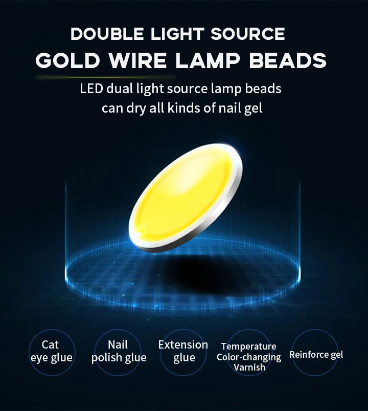 | Mengeringkan Segala Gel Kuku Dibekali dengan dua sumber lampu LED yang dilapisi kawat emas sehingga dapat mengeringkan segala jenis gel kuku secara optimal. Anda pun dapat menggunakan berbagai jenis nail art yang Anda suka, tanpa takut gagal karena tidak kering maksimal.
