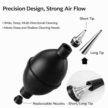 | 2 Nozzle Pendek dan Panjang Kelengkapan dua nozzle pendek memudahkan kamu untuk menjangkau sudut-sudut sempit, sedangkan gagang panjang memungkinkan kamu membersihkan bagian dalam body kamera, lorong lensa, atau area yang sulit dijangkau sekalipun tanpa takut menyentuh permukaan sensitif. |