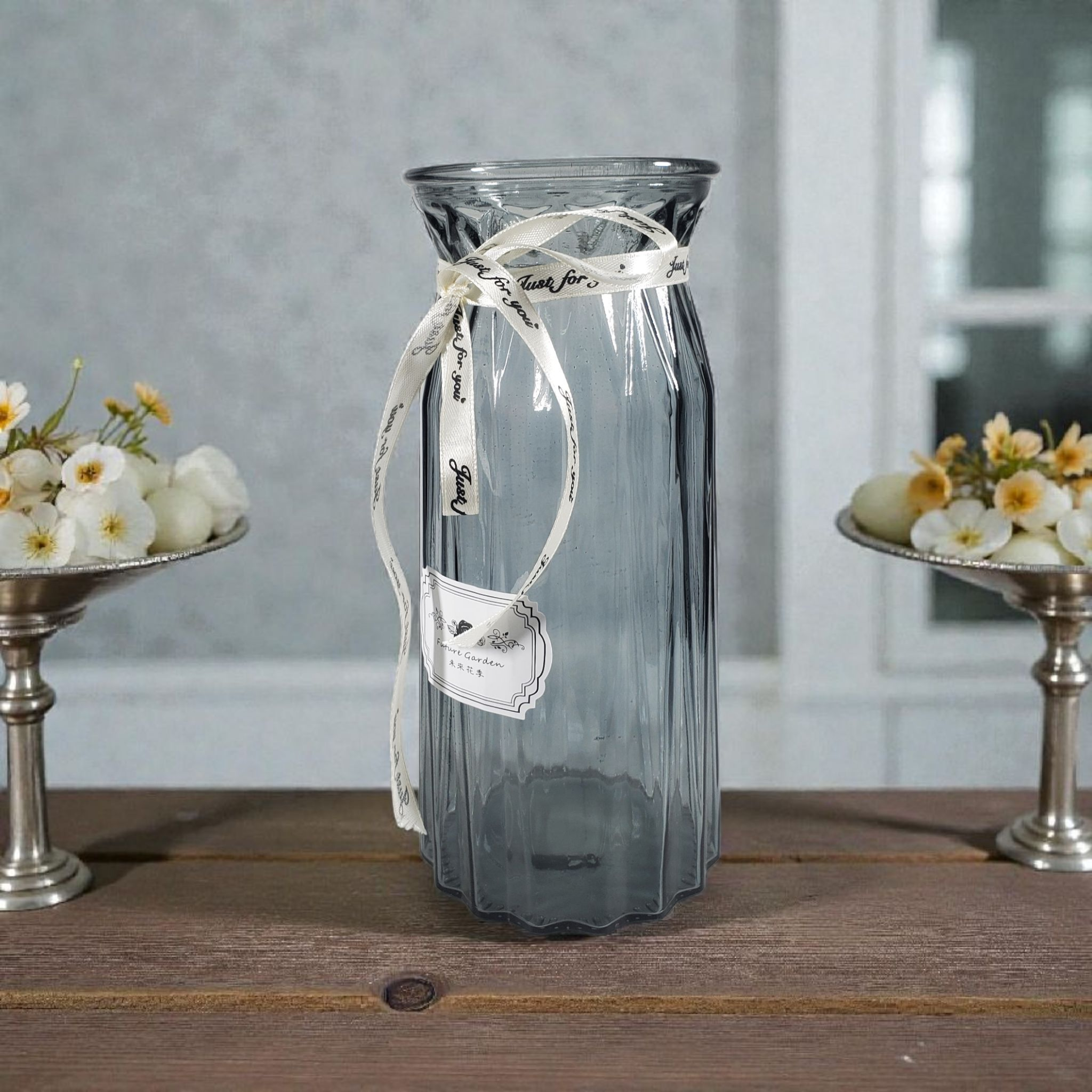 Vas BOLITE dari kaca tebal memancarkan kilau indah saat terkena cahaya. Cocok untuk bunga, ranting, atau dekorasi DIY. Desain Nordic dan pita lehernya menambah estetika.