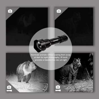 | Pancaran Cahaya Inframerah Kuat Senter dari TaffLED memancarkan cahaya inframerah 850 nm yang hanya bisa ditangkap oleh perangkat night vision, seperti kamera IR, monokular, teropong, dan perangkat keamanan. Cahaya ini membantu meningkatkan detail dalam kondisi gelap tanpa menarik perhatian target atau mengganggu lingkungan sekitar. Cahaya inframerah hanya bisa efektif atau berguna bila digunakan ketika Anda merekam video atau mengambil gambar. |