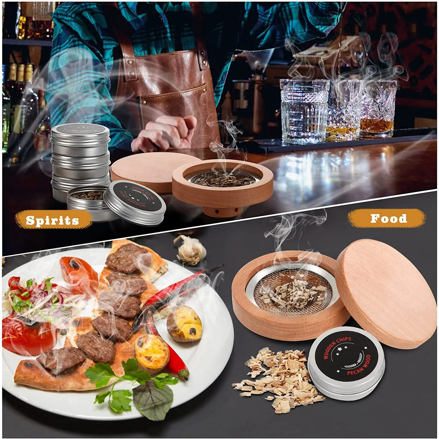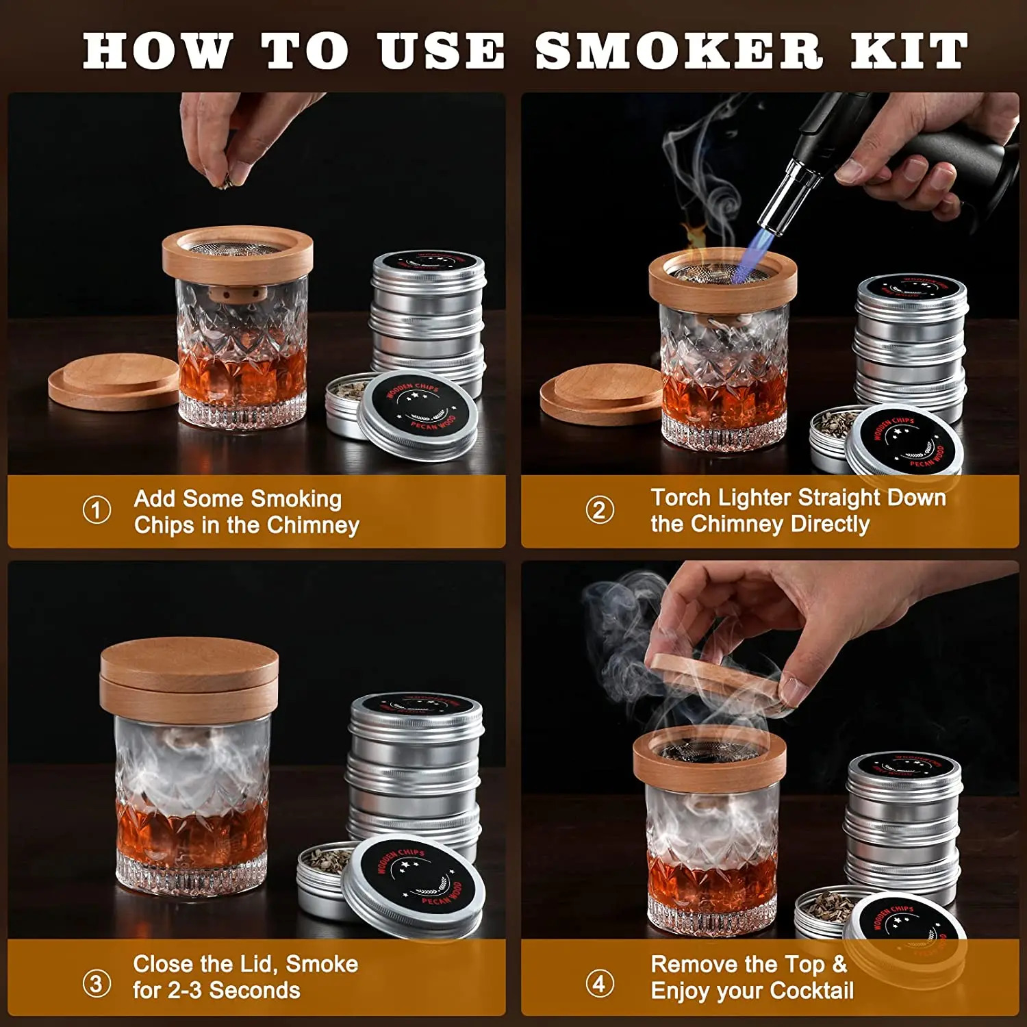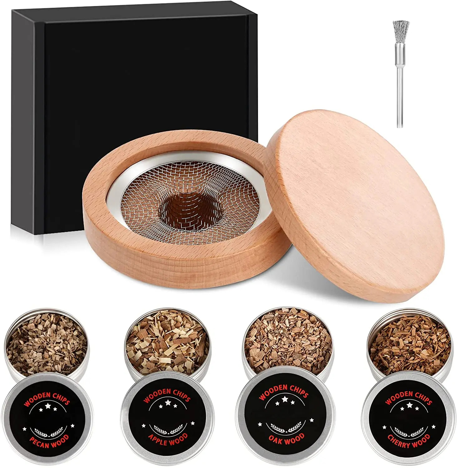 | Dilengkapi dengan 4 Jenis Wood Chips Premium Untuk menciptakan pengalaman aroma yang lebih autentik, alat ini dilengkapi dengan 4 jenis wood chips premium, seperti oak, apple, pecan, dan cherry. Setiap jenis chip memberikan aroma khas yang menambah kenikmatan dan kesan istimewa pada setiap minuman Anda. |
