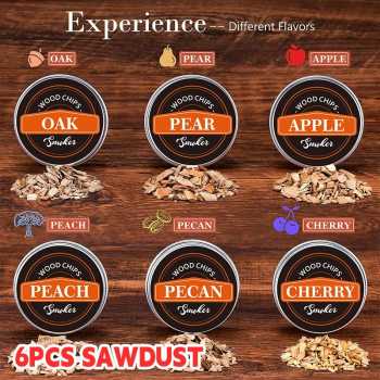 | Dilengkapi dengan 6 Jenis Wood Chips Premium Untuk menciptakan pengalaman aroma yang lebih autentik, alat ini dilengkapi dengan enam jenis wood chips premium, seperti oak, pear, apple, peach, pecan, dan cherry. Setiap jenis chip memberikan aroma khas yang menambah kenikmatan dan kesan istimewa pada setiap minuman Anda. |