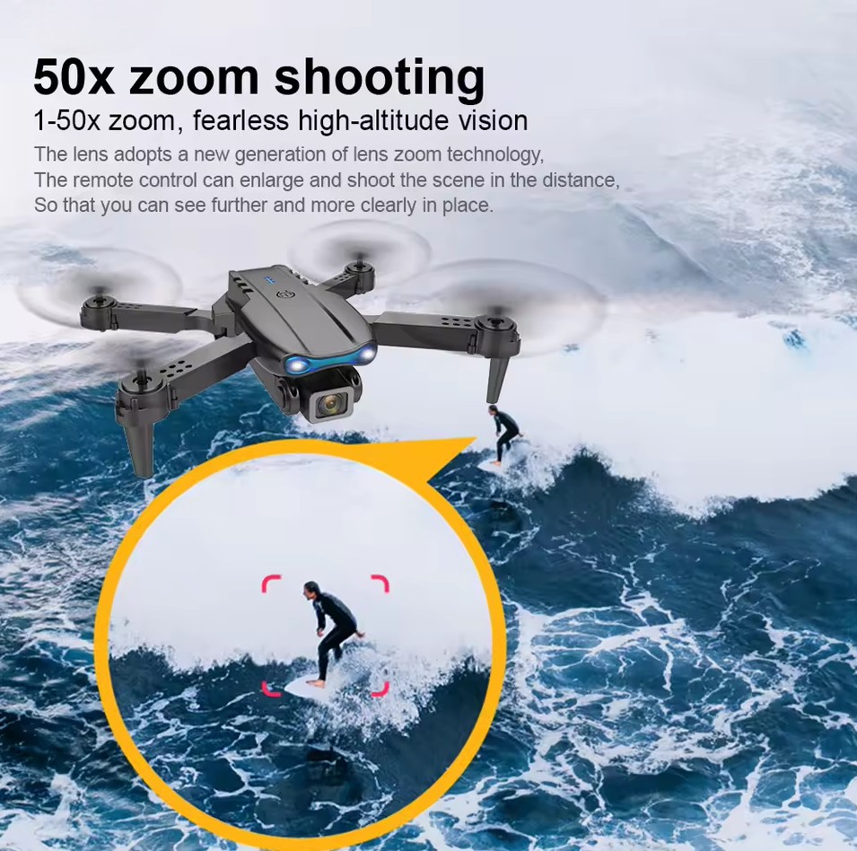 | Dual Kamera Drone BRDRC E99 menghadirkan dual kamera beresolusi 4K HD yang mampu mengambil gambar dan video berkualitas tinggi. Kamera ini juga mendukung zoom hingga 50X untuk menangkap detail objek dari kejauhan. Kualitas visual yang dihasilkan tajam dan jernih, menjadikan setiap momen udara Anda terekam dengan baik. |
