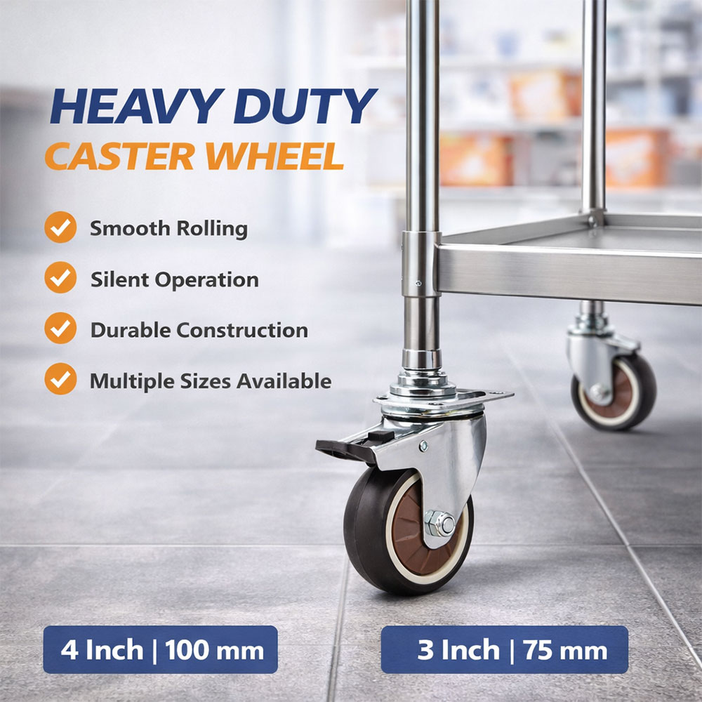 Pilih ukuran sesuai kebutuhan Anda. 3 inch (75mm) ideal untuk furnitur ringan hingga sedang seperti laci, rak kecil, atau meja lipat. 4 inch (100mm) memberikan kapasitas beban lebih besar dan guliran lebih mulus, cocok untuk lemari, rak besar, meja kerja, hingga trolley.