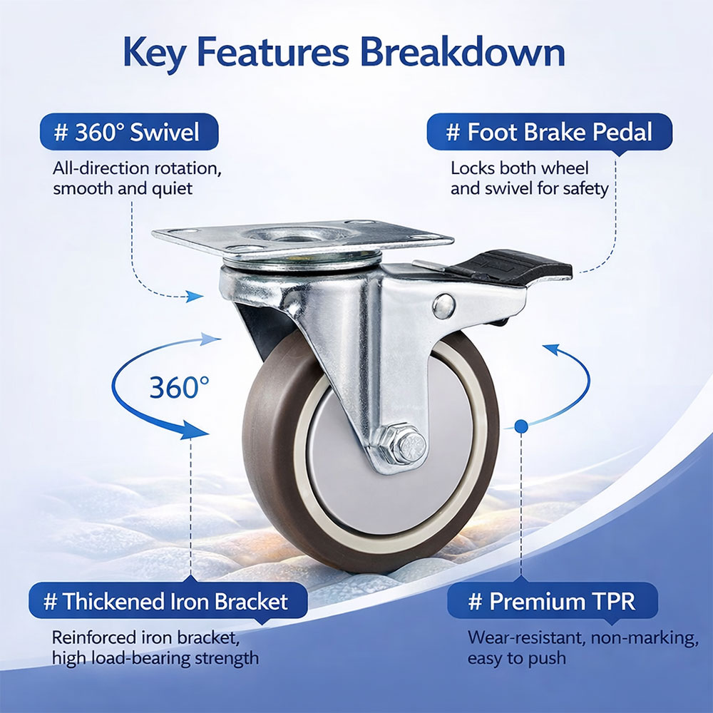 Dilengkapi pedal rem injak yang mengunci sekaligus dua fungsi yaitu, mengunci putaran roda dan mengunci rotasi swivel secara bersamaan. Fitur double-lock ini memastikan objek benar-benar tidak bergerak dari segala arah, baik maju-mundur maupun berputar, sehingga keamanan penggunaan jauh lebih terjamin. Rem dapat dikunci dan dibuka hanya dengan tekanan kaki, tanpa perlu membungkuk.
