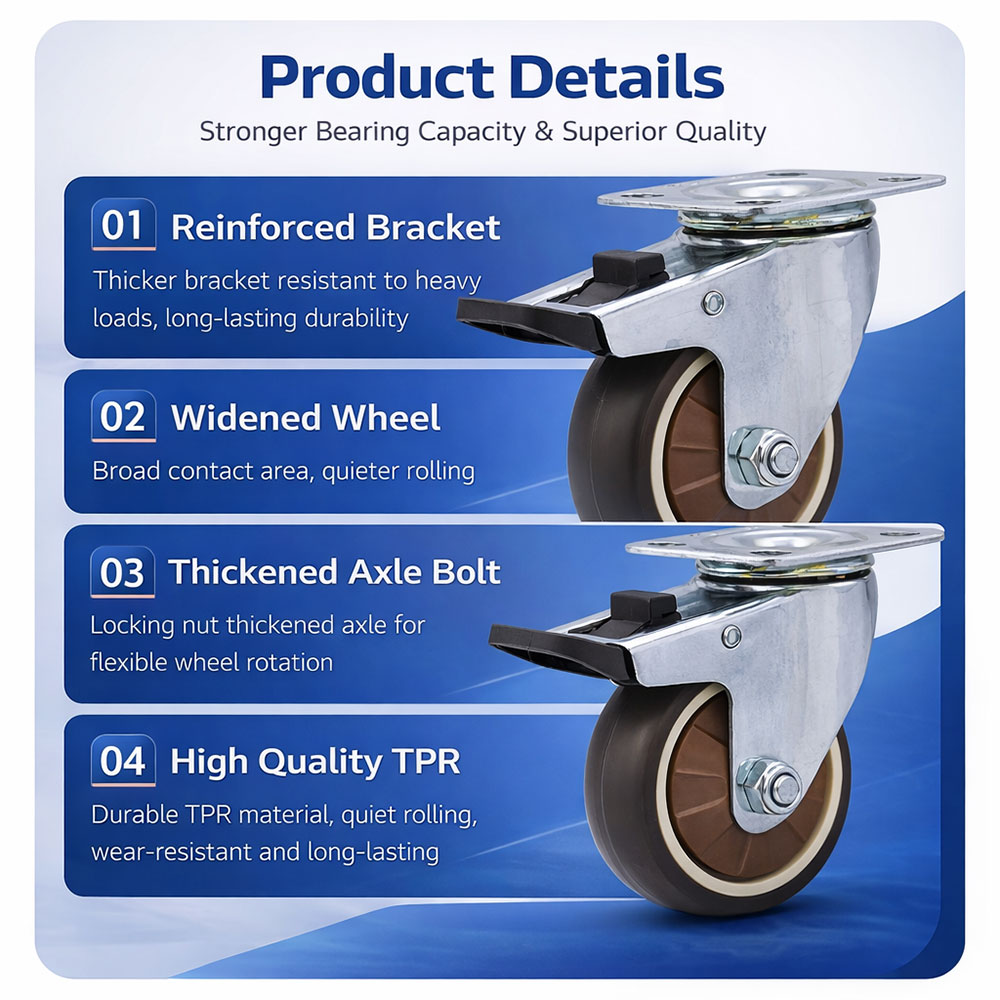 Karakteristik TPR yang elastis dan empuk tidak hanya melindungi lantai, tetapi juga meredam getaran dan benturan ringan saat roda bergerak atau melewati permukaan yang tidak rata. Ini membantu menjaga isi furnitur tetap stabil selama pemindahan, sangat cocok untuk rak yang menyimpan barang pecah belah atau perangkat elektronik sensitif.