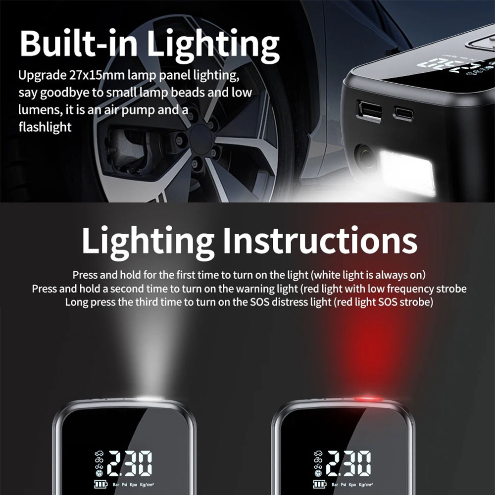 | Memompa dengan Bantuan Senter LED Bagian atas pompa ban elektrik ini dilengkapi dengan senter yang bisa Anda gunakan sebagai penerangan tambahan saat mengisi angin. Senter ini memiliki 2 mode penggunaan, yakni normal dan berkedip (SOS). Anda juga bisa menggunakan senter untuk memberi isyarat darurat atau SOS. |