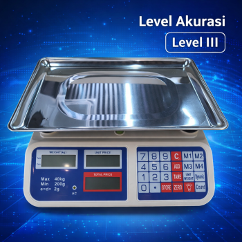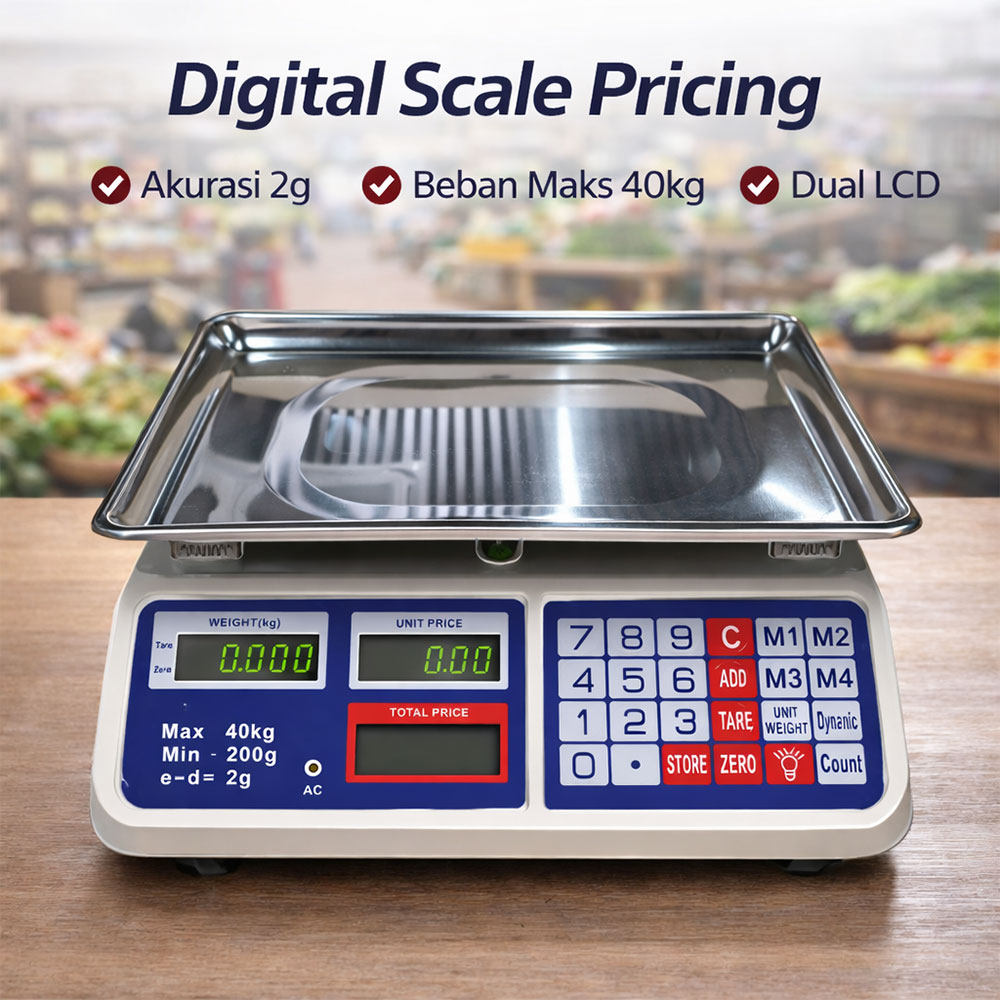 | Sistem Hitung Harga Otomatis (Pricing Scale) Anda cukup memasukkan harga per kg, lalu timbangan akan otomatis menghitung total harga sesuai berat barang yang ditimbang. Fitur ini membuat proses jual beli jauh lebih cepat karena tidak perlu menghitung manual setiap transaksi. Keunggulannya, sistem ini membantu mengurangi human error dan membuat pelayanan kepada pelanggan terlihat lebih profesional. |