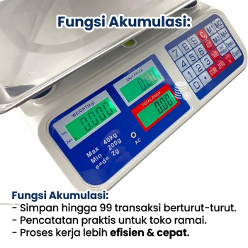 | Fungsi Akumulasi Hingga 99 Kali Transaksi Produk ini memiliki fungsi akumulasi yang dapat menyimpan hasil transaksi hingga 99 kali. Fitur ini membantu pengguna yang melakukan banyak transaksi berturut-turut agar pencatatan lebih praktis. Keunggulannya, proses kerja menjadi lebih efisien terutama untuk toko atau kios dengan pembeli ramai. |