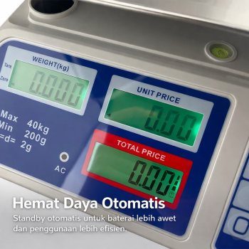 | Hemat Energi dengan Mode Standby Otomatis Timbangan memiliki mode standby otomatis saat tidak digunakan untuk membantu menghemat konsumsi daya. Fungsi ini sangat berguna untuk pemakaian sepanjang hari karena baterai menjadi lebih awet dan efisien. Keunggulannya, pengguna tidak perlu terlalu sering mengisi ulang daya sehingga penggunaan menjadi lebih praktis untuk usaha harian. |